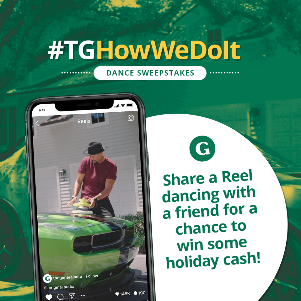 3. Using IG Reels, create a video appearing your self and one different individual dancing to a track discovered inside Instagram’s Reel Music Library. Tag @thegeneralauto in it and use the hashtag #TGHowWeDoIt.
